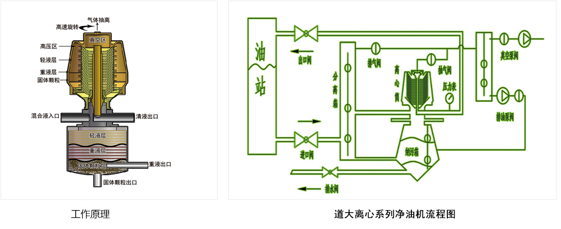 含有金属颗粒和水的油液经由离心筒离心叶轮加速压缩至离心筒,随离心筒同步高速旋转,由于不同密度介质所受离心力不同,在离心筒内自然分层,固相颗粒由小积成大,沉降在转鼓最外层,重液相(水)在外层,清液相(油)在内层,油液通过碟片分离后,排出离心筒,达到分离的目的。